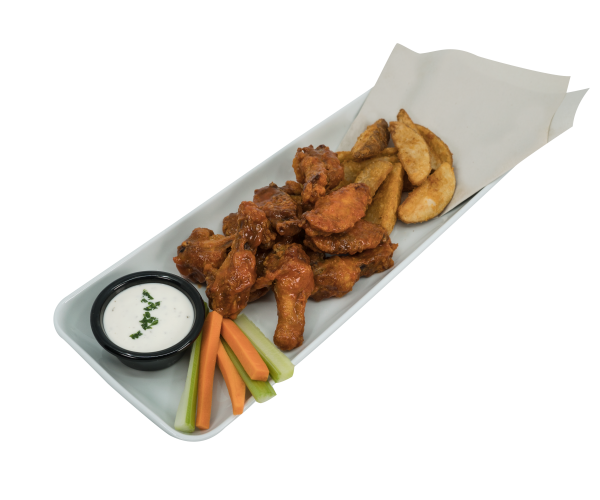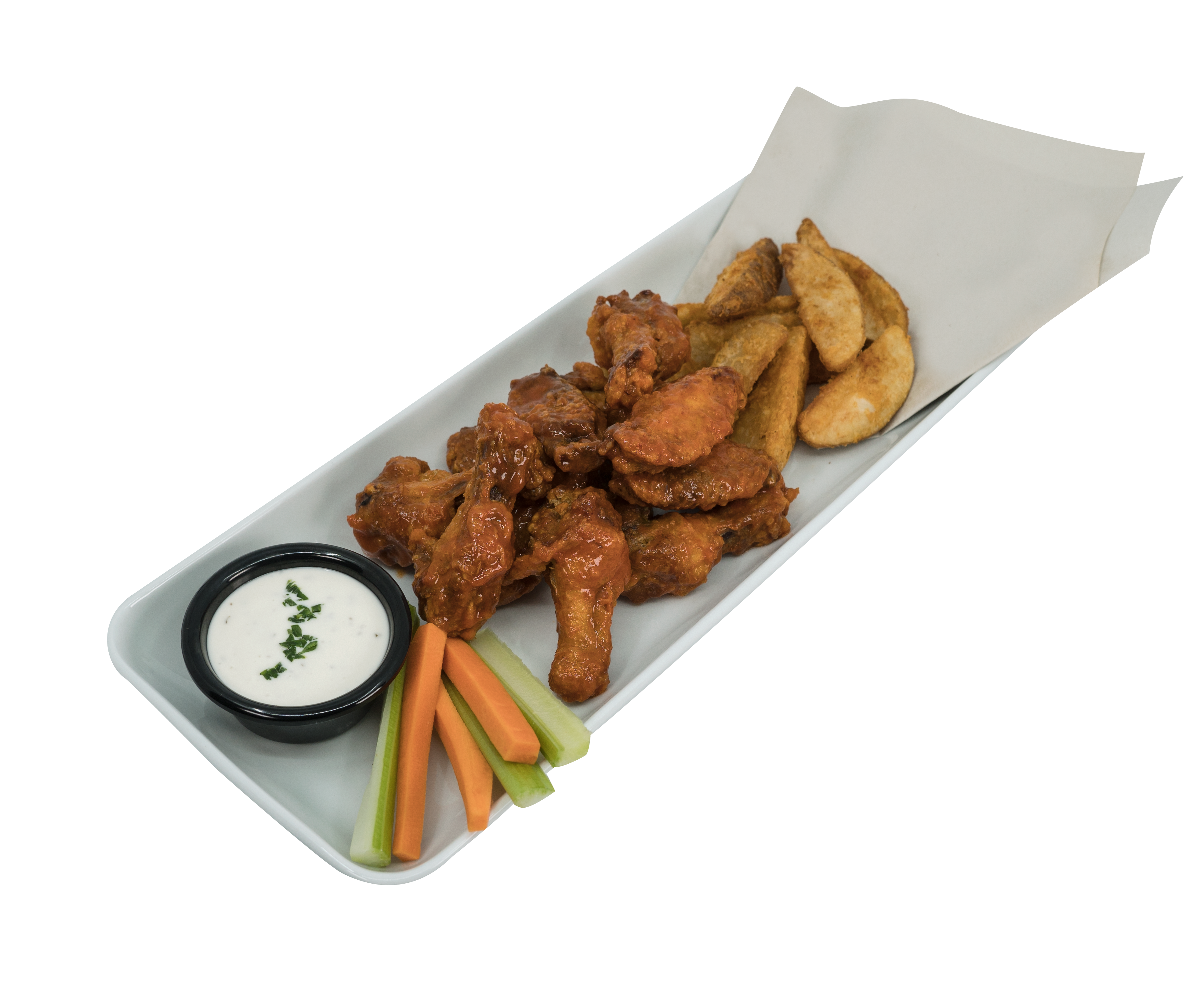 Alitas de pollo fritas, bañadas en salsa a elegir , acompañadas de papas gajo , zanahorias en tiras, apio en tiras y aderezo ranch.