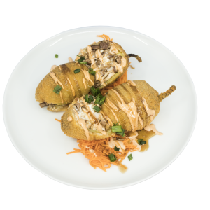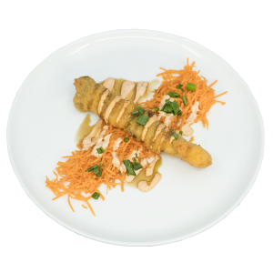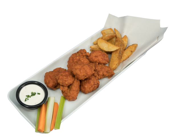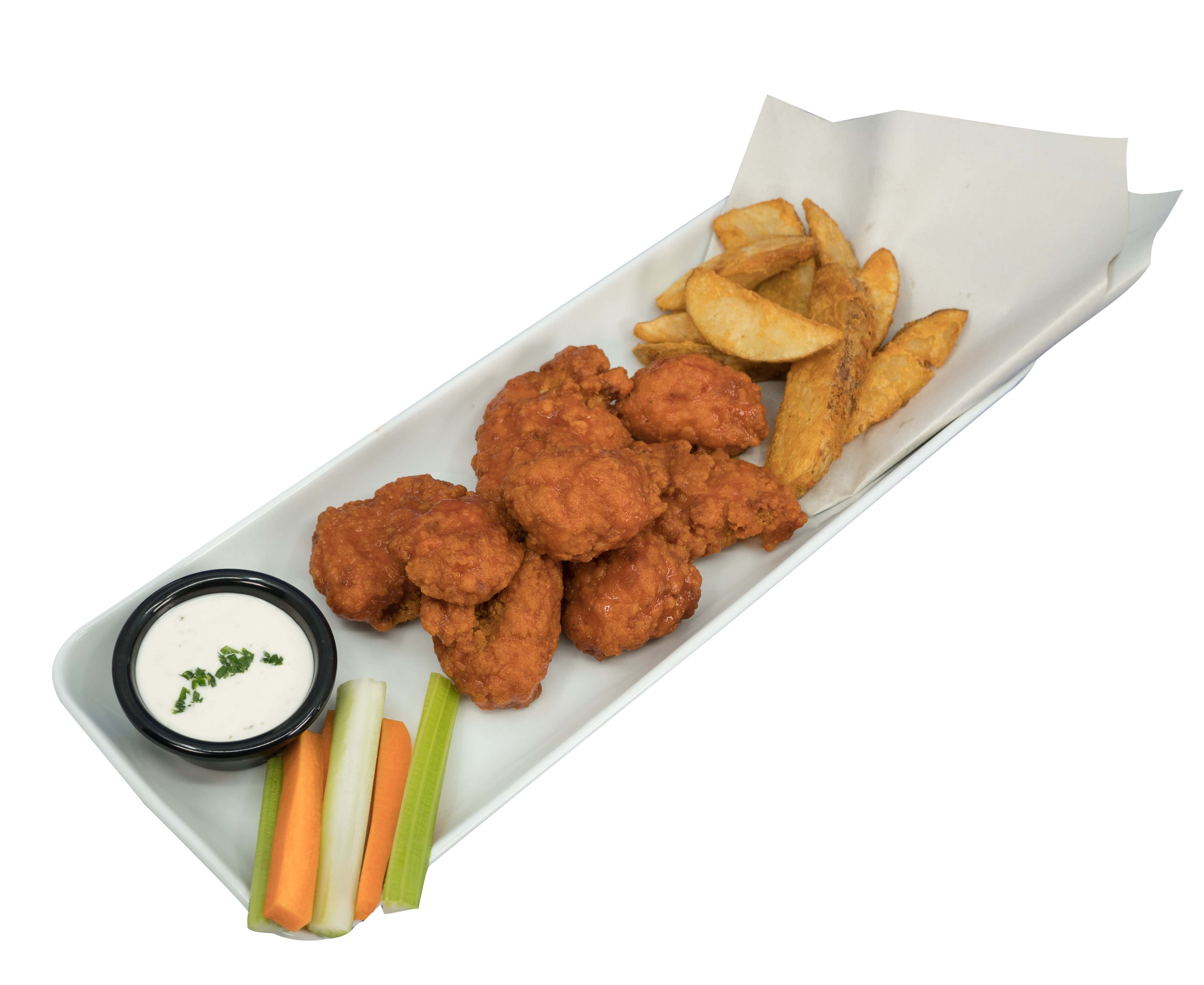 Boneless de pollo fritos, bañados en salsa a elegir , acompañados de papas gajo , zanahorias en tiras, apio en tiras y aderezo ranch.