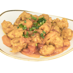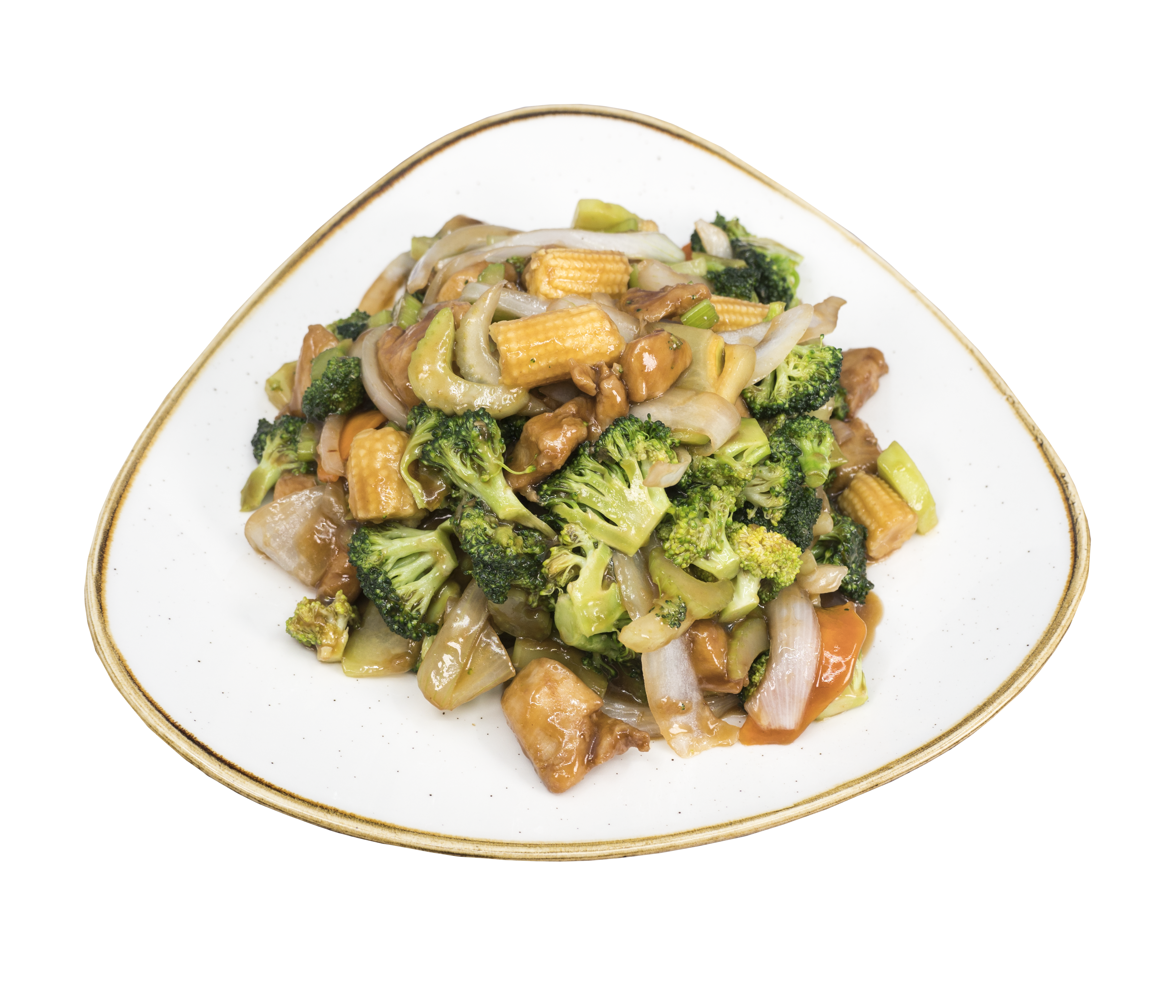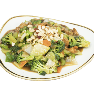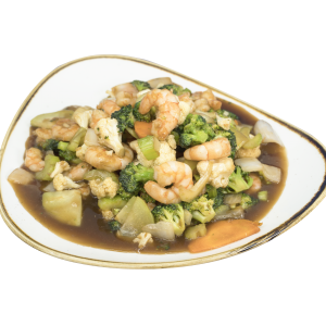 Guiso de la proteína a elegir en salsa de ostión con zanahoria, cebolla blanca, brócoli, apio, chayote, salsa especial china.