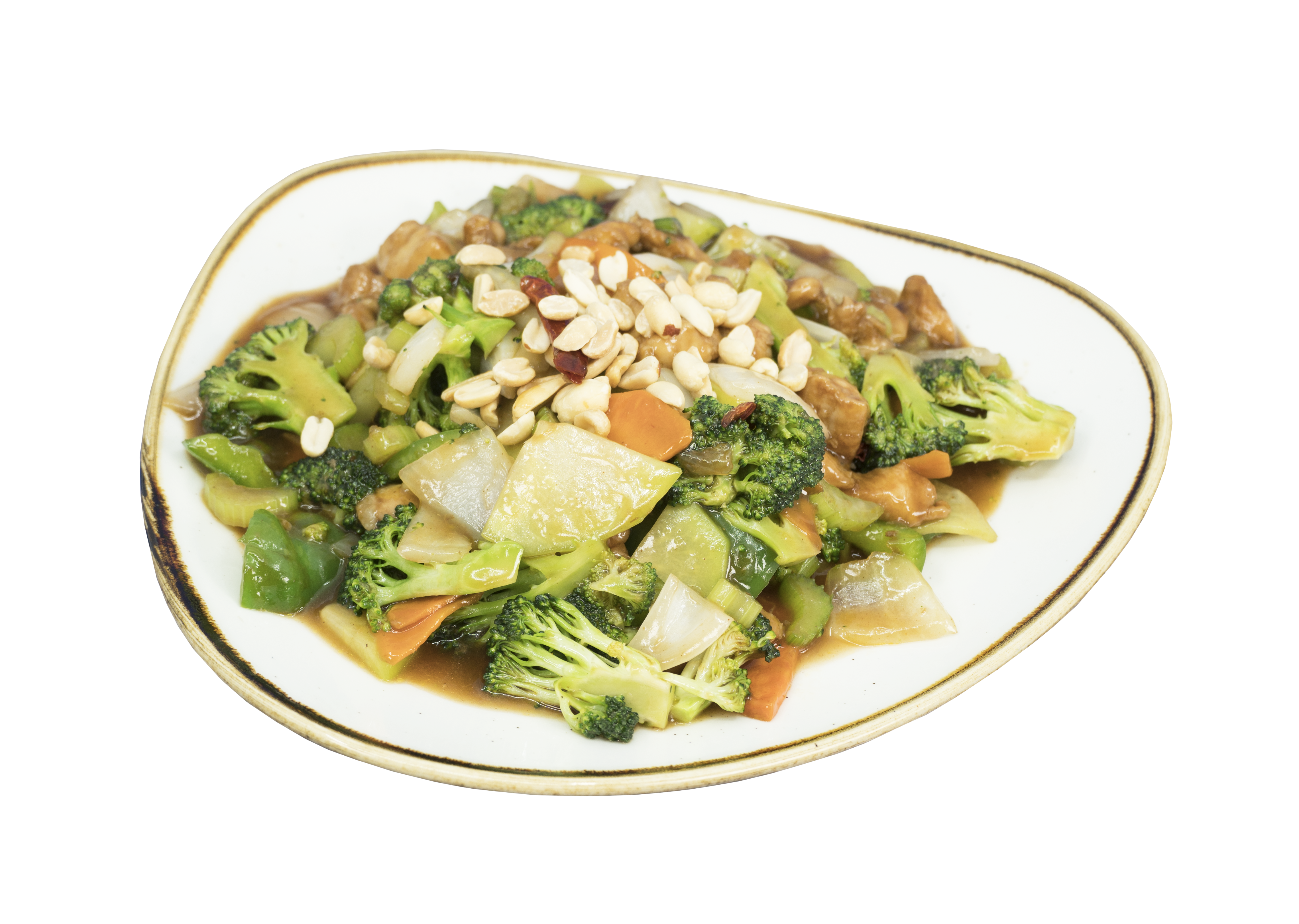Guiso de la proteína a elegir en salsa de ostión con zanahoria, cebolla blanca, brócoli, apio, chayote, salsa especial china.