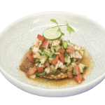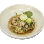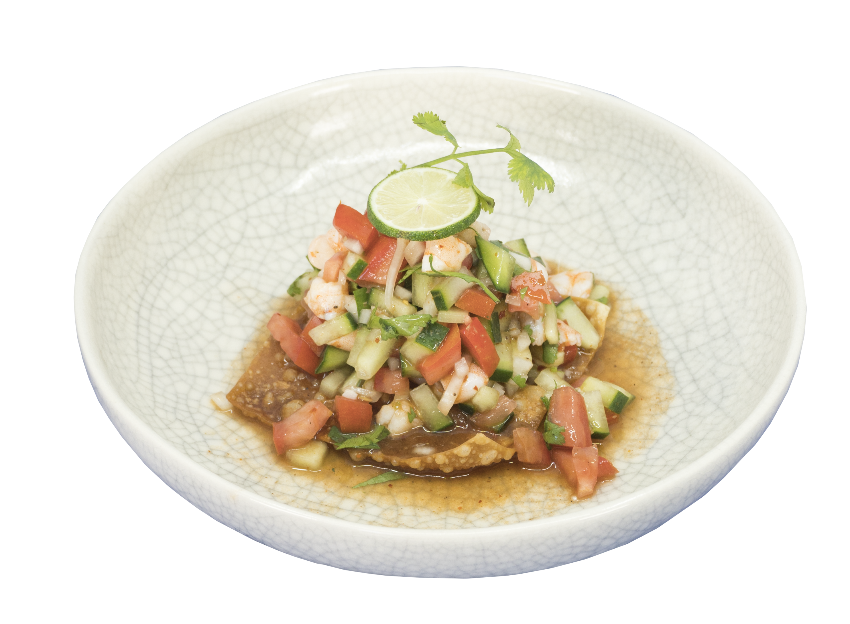 Tostadita de ceviche de camarón Ceviche de camarón cocido montado sobre una hoja de wonton. 1 pieza. |