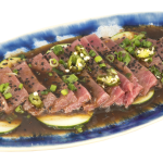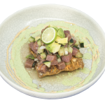 Sashimi de atún Medallón de atún en laminas montado sobre una cama de pepino, bañado en un preparado de salsa. |